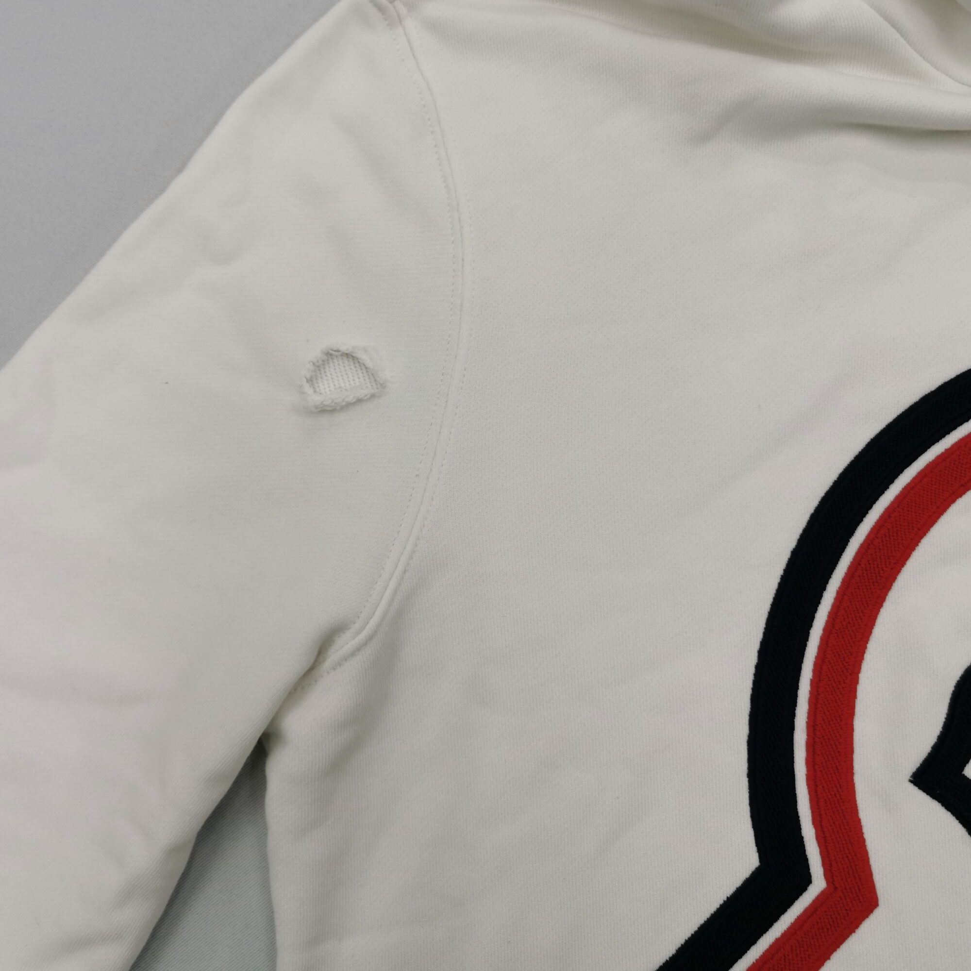 前裾部分に3ミリ程度の穴が開いています。ベルトの金具(バックル)があたることで、このように穴が開いてしまうことが多いです。着用の際、気を付けにくい箇所ではありますが、大切なTシャツを着るときは、ベルトのバックルも少し注意していただくと長く着用できると思います。