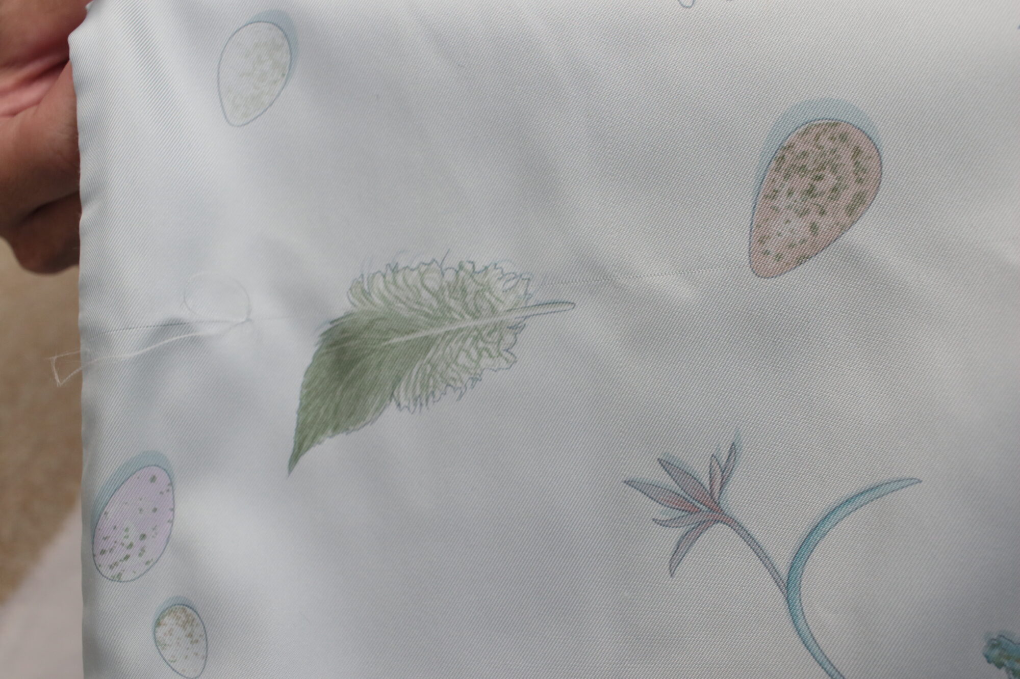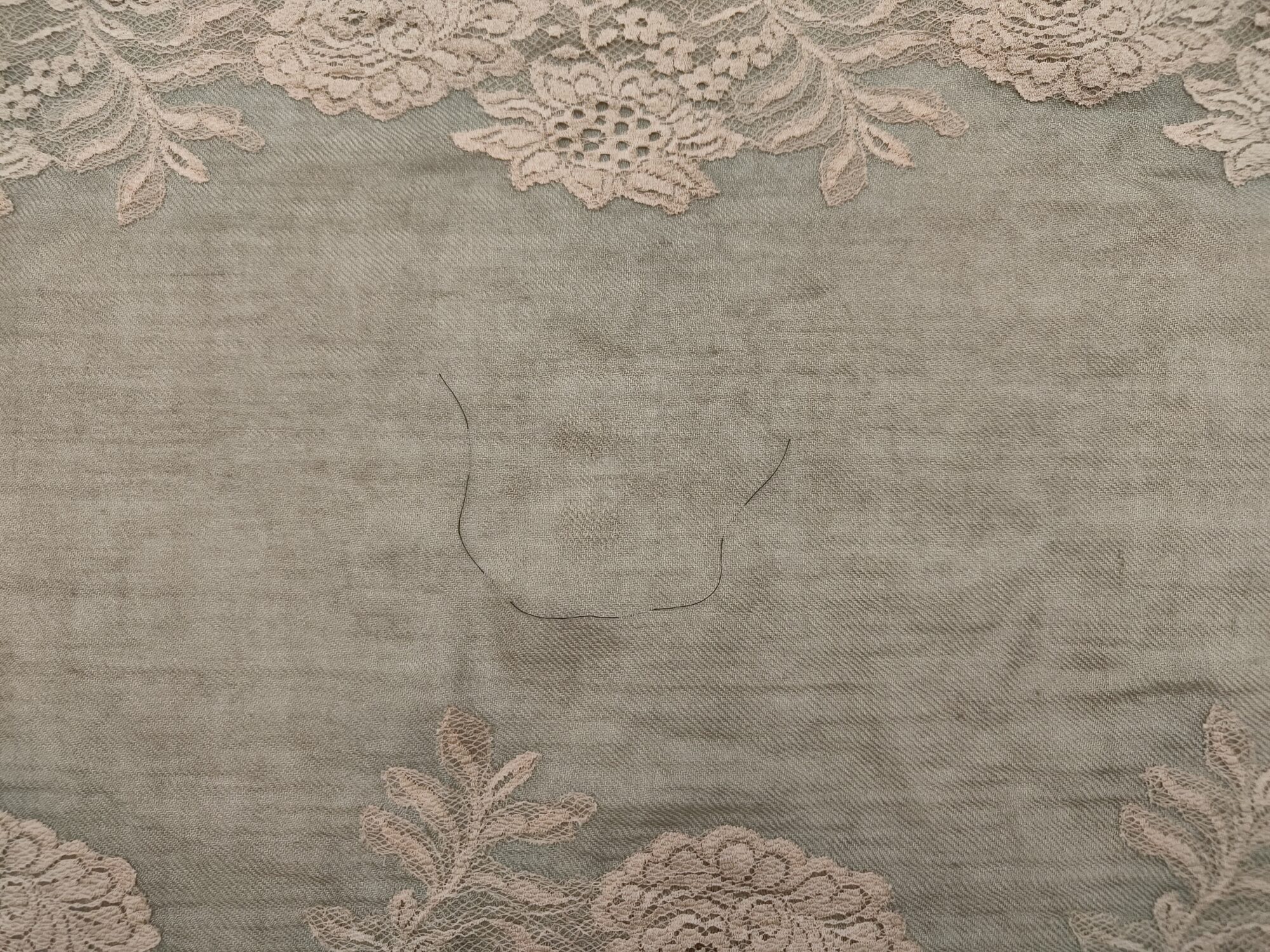 修復方法: シルクのストールは非常に引っかかりやすく繊細な素材となります。糸引きを戻していきますが、多少の柄ズレと、引けによりできた線が多少残っています。糸が出てしまったとき切ってしまうと仕上がりが大きく変わってくるので切らないでお持ちください。