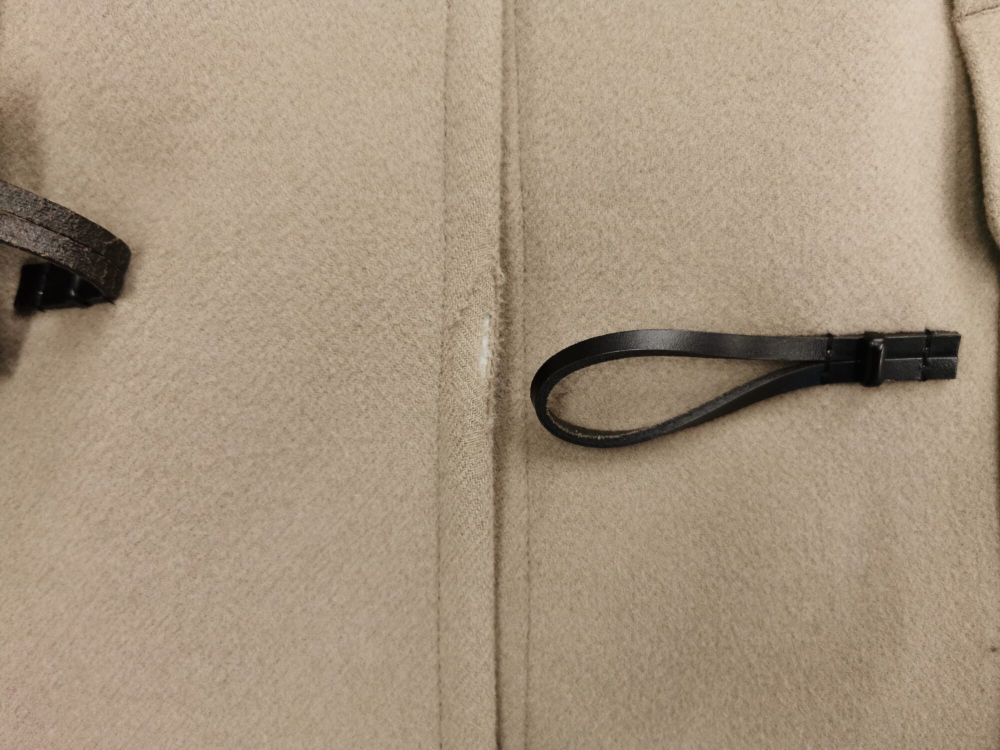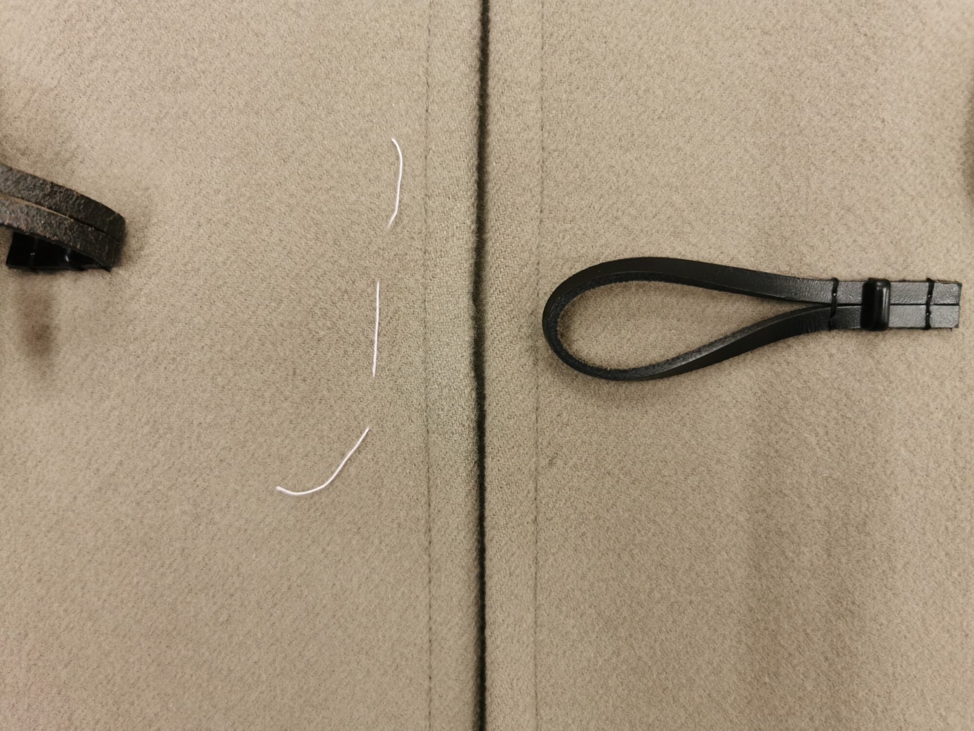 トグルの横部分は着用によってスレキズができてしまうことが多々あります。避けるのが難しいキズではありますが、ひどくなって周りの生地まで裂けてしまう前に、早い段階でご依頼いただくことをお勧めします。着用による色褪せが出ていることから多少の色違いは出ていますが、そこまで違和感なく仕上げることができました。